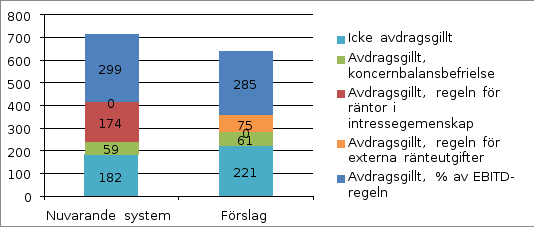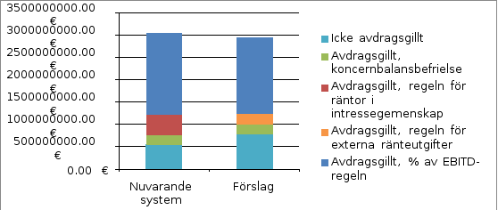 Liksom nu får ränteutgifterna dras av till fullt belopp till de delar de motsvarar ränteinkomsternas belopp. Om nettoränteutgifterna, som avser de ränteutgifter som överstiger ränteinkomsterna, uppgår till högst 500 000 euro under skatteåret får de dras av i sin helhet. När nettoränteutgifterna överstiger det nämnda beloppet får nettoränteutgifterna dras av till den del de uppgår till högst 25 procent av det ovan angivna justerade resultatet av näringsverksamheten. Nettoränteutgifter som överstiger den procentuella andelen ska inte vara avdragsgilla. Med avvikelse från detta får nettoränteutgifter som betalats till parter som inte är i koncerngemenskap dras av till ett belopp av 3 000 000 euro.