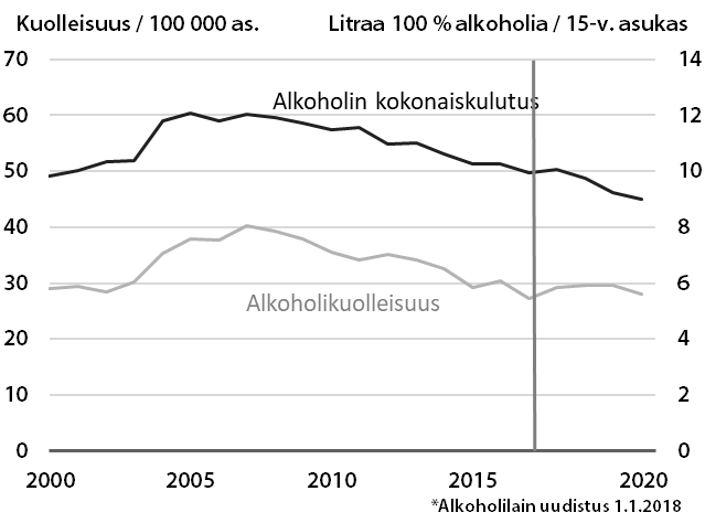 Utvecklingen av alkoholens negativa effekter har i huvudsak följt förändringarna i totalkonsumtionen. Mellan 2007 och 2017 minskade dödligheten i alkoholrelaterade sjukdomar och alkoholförgiftning kraftigt, till och med kraftigare än totalkonsumtionen (figur 1). Den långvariga, kraftiga nedåtgående trenden för alkoholrelaterad dödlighet bröts 2018. Även om den totala alkoholkonsumtionen har fortsatt att minska även efter reformen som trädde i kraft 2018, har de alkoholrelaterade dödsfallen inte minskat i samma grad som väntat. Detta kan tyda på att storkonsumenter, för vilka alkoholkonsumtion redan kan ha orsakat till exempel leverskador, har ökat sin konsumtion av alkoholdrycker mer än andra konsumenter efter reformen. Utöver reformen av alkohollagen 2018 kan eskaleringen av alkoholproblem relaterade till coronapandemin ha ökat alkoholskadorna, särskilt under 2020. År 2021 sjönk däremot alkoholdödligheten med 4 procent jämfört med år 2020, vilket visar att alkoholdödligheten varierar beroende från år till år. År 2022 dog sammanlagt 1 664 personer i alkoholrelaterade sjukdomar och alkoholförgiftning.