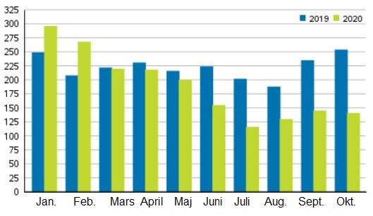 Statistikcentralen. Anhängiggjorda konkurser januari–oktober 2019–2020