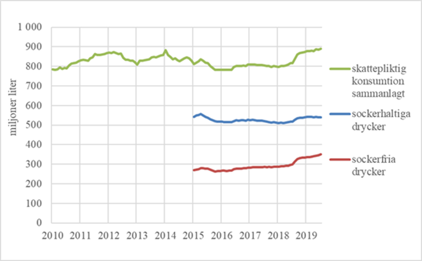 Figur 1. Konsumtionen av skattepliktiga läskedrycker från och med 2010, 12 månaders glidande summa