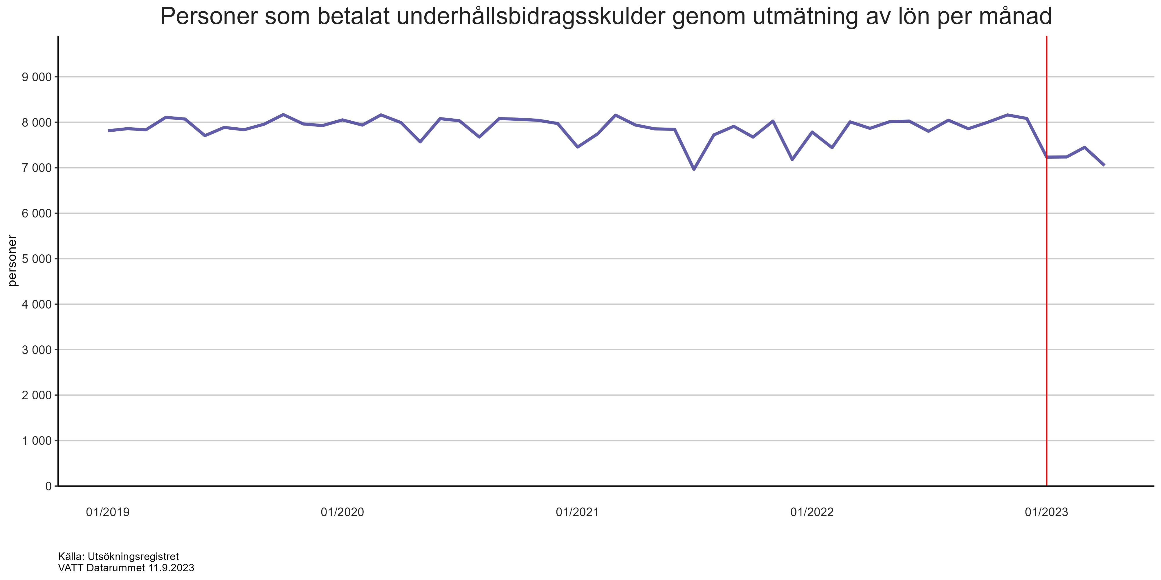 Också antalet gäldenärer som betalat underhållsbidragsskuld genom utmätning av lön har minskat i början av 2023, vilket visar att en del av gäldenärerna i underhållsbidragsärenden till följd av höjningen av det skyddade beloppet inte längre omfattas av utmätning. Till denna del är konsekvensen större än den ovan beskrivna konsekvensen för indrivningsresultatet. I början av 2023 betalade i genomsnitt omkring 7 200 personer per månad underhållsbidragsskulder genom utmätning av lön, medan antalet under motsvarande period 2022 var omkring 7 800 personer per månad. I följande graf presenteras antalet personer per månad som betalat underhållsbidragsskulder genom utmätning av lön från och med januari 2019.