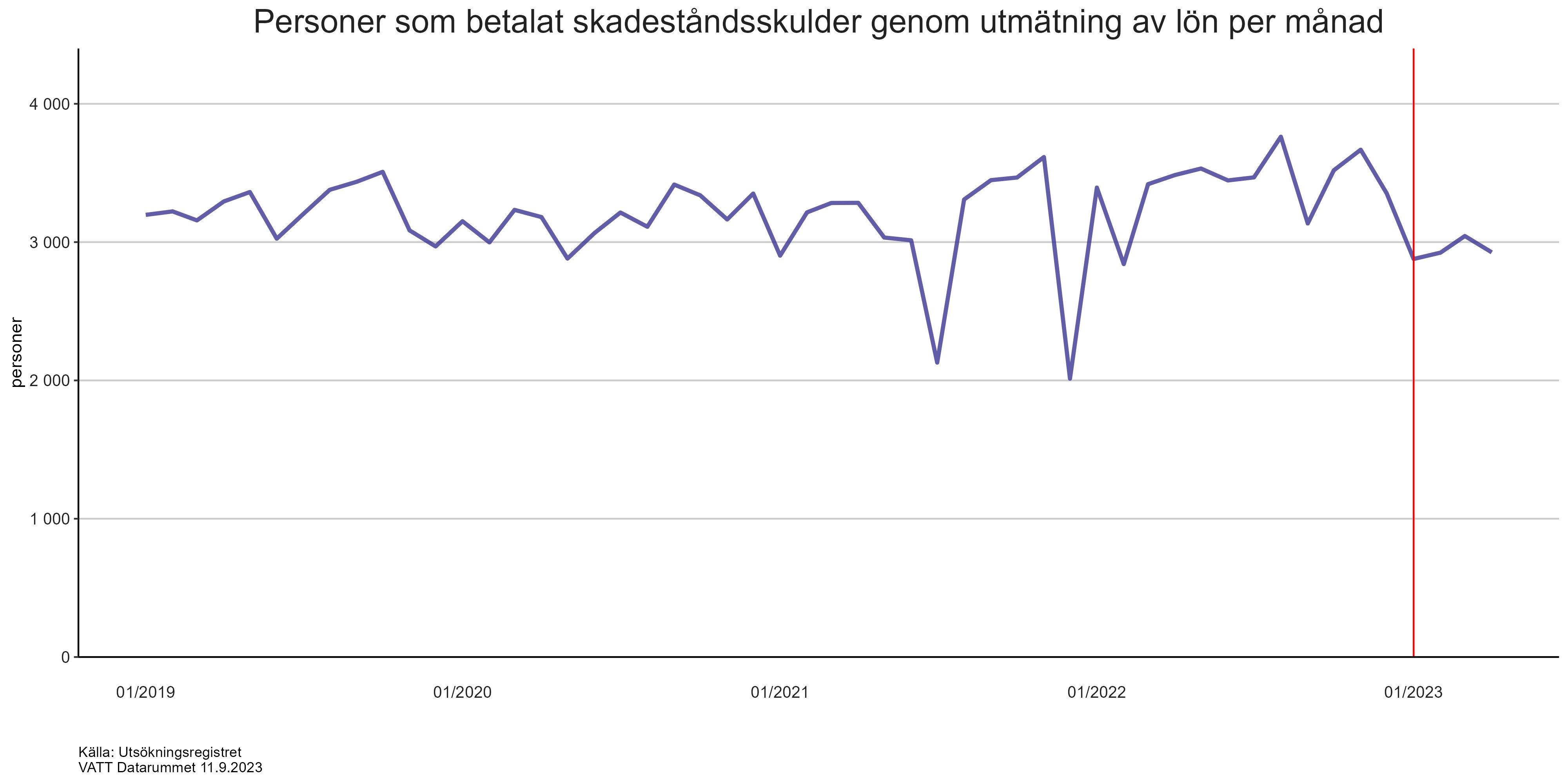 Också antalet gäldenärer som gjort betalningar för skadeståndsärenden har minskat efter det att det skyddade beloppet höjdes. I början av 2023 betalade i genomsnitt omkring 2 900 personer per månad skadeståndsskulder genom utmätning av lön, medan antalet under motsvarande period 2022 var omkring 3 300 personer per månad. I följande graf presenteras antalet personer per månad som betalat skadeståndsskulder genom utmätning av lön från och med januari 2019.