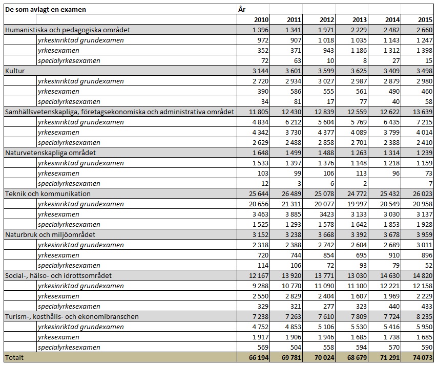 Tabell 1. De som avlagt en yrkesinriktad examen 2010—2015, inkl. arbetskraftsutbildning