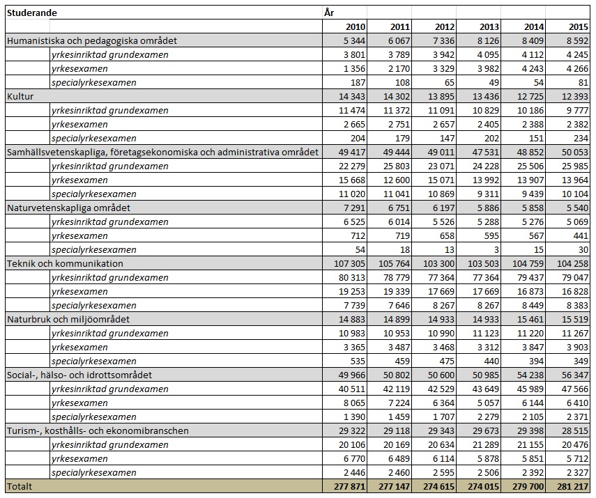 Tabell 2. Studerande inom examensinriktad yrkesutbildning 2010—2015, inkl. arbetskraftsutbildning