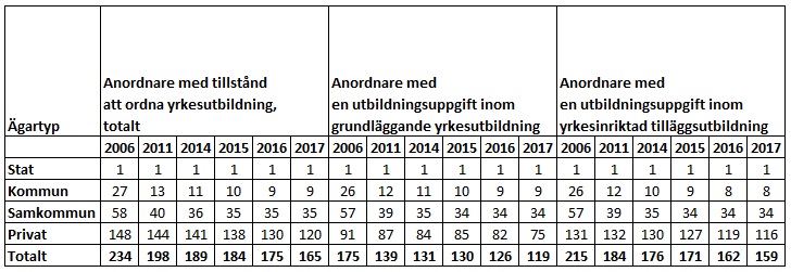 Tabell 3. Antalet anordnare av yrkesutbildning enligt ägartyp åren 2006—2017, situationen i början av 2016