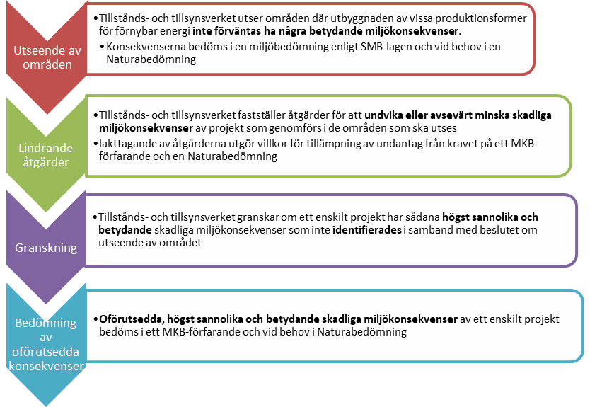 Syftet med beslutet är att fastställa var och med vilka åtgärder för att lindra miljökonsekvenserna införandet av en viss typ av förnybar energi inte förväntas ha några betydande miljökonsekvenser. Till följd av detta ska inte konsekvenserna av enskilda projekt för förnybar energi som genomförs i de berörda områdena och i enlighet med de relevanta lindrande åtgärderna behöva bedömas projektspecifikt i ett MKB-förfarande eller en Naturabedömning, och projekten kan således bli föremål för ett påskyndat tillståndsförfarande med kortare tidsfrister.