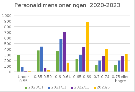 Flera faktorer som tidsmässigt delvis sammanfaller i omvärlden har gjort det svårare att förbättra personaldimensioneringen så att en dimensionering på minst 0,7 anställda kan uppnås inom den tidsfrist i början av december detta år som lagen förutsätter. En del av verksamhetsenheterna har ändå haft en högre personaldimensionering än den minimidimensionering (0,65) som varit i kraft sedan den 1 april 2023. I maj 2023 hade 23 procent av verksamhetsenheterna (N=410) en dimensionering på 0,70–0,74 och 17 procent (N=309) en dimensionering på minst 0,75.