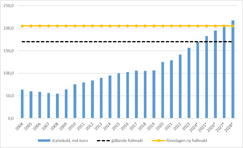 De senaste årens kriser har drivit på utvecklingen av statens skuldsättning. Först covid-19-pandemin och sedan Rysslands anfallskrig mot Ukraina och dess följdverkningar ökade statens upplåningsbehov avsevärt. Finansministeriets prognoser visar att statens skuldsättning kommer att fortsätta också under de närmaste åren. Enligt nuvarande prognos kan skuldbeloppet tillfälligt överskrida den gällande fullmakten att uppta lån redan under hösten 2024. I slutet av prognosperioden, år 2028, beräknas statsskulden uppgå till nästan 217 miljarder euro.