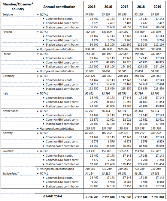 e) Annual contributions are listed in Table 2; Note: the budget is an estimate based on countries intention to become ICOS ERIC in 2013. It will be revised based on the final membership by the first GA.