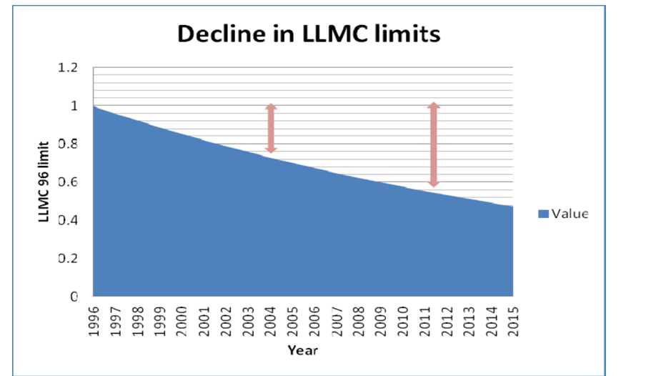 Figur 1: Relativ värdeminskning för gränser enligt LLMC 96. (Källa: LEG 99/4/3, Relative decline in value of LLMC 96 limits)