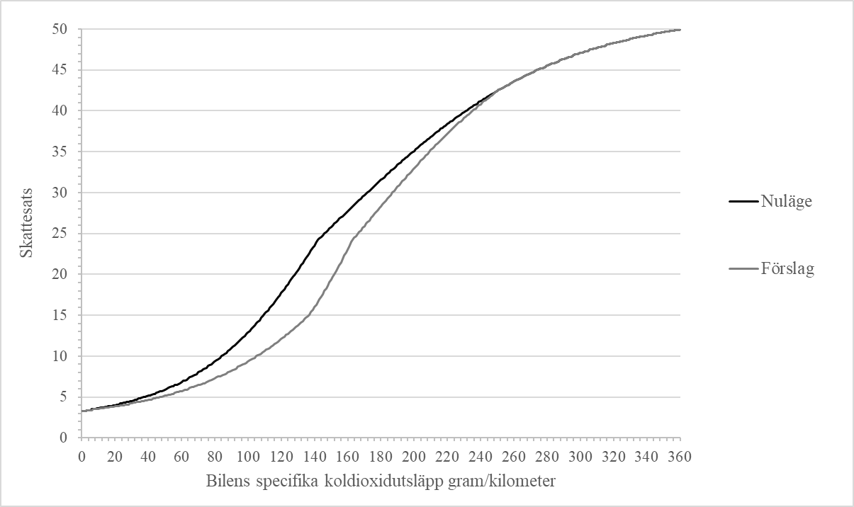 I figur 2 beskrivs den föreslagna ändringen av bilskattekurvan 2018 och i figur 3 beskrivs ändringen av bilskattekurvan 2019.