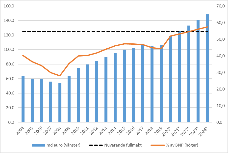 Coronavirusepidemin (COVID-19) som under våren spred sig globalt har snabbt förändrat bilden av den kommande ekonomiska utvecklingen. Finansministeriet bedömde ännu i oktober 2019 att samhällsekonomin kommer att växa med cirka en procent 2020 och att statens behov av nettoupplåning kommer att uppgå till cirka tre miljarder under de följande två åren. I finansministeriets prognos som offentliggjordes i april 2020 förväntas bruttonationalprodukten minska med 5,5 procent och statens behov av nettoupplåning överstiga 12 miljarder euro i år. Om denna utveckling förverkligas kommer statsskulden att vara omkring 119 miljarder euro vid utgången av 2020. Enligt prognosen kommer statssektorn att ha ett klart underskott under de kommande åren och statsskuldens belopp att öka till ett större belopp än vad det med stöd av riksdagens gällande fullmakt kan vara under nästa år. I slutet av prognosperioden 2024 beräknas statsskulden uppgå till 148 miljarder euro.