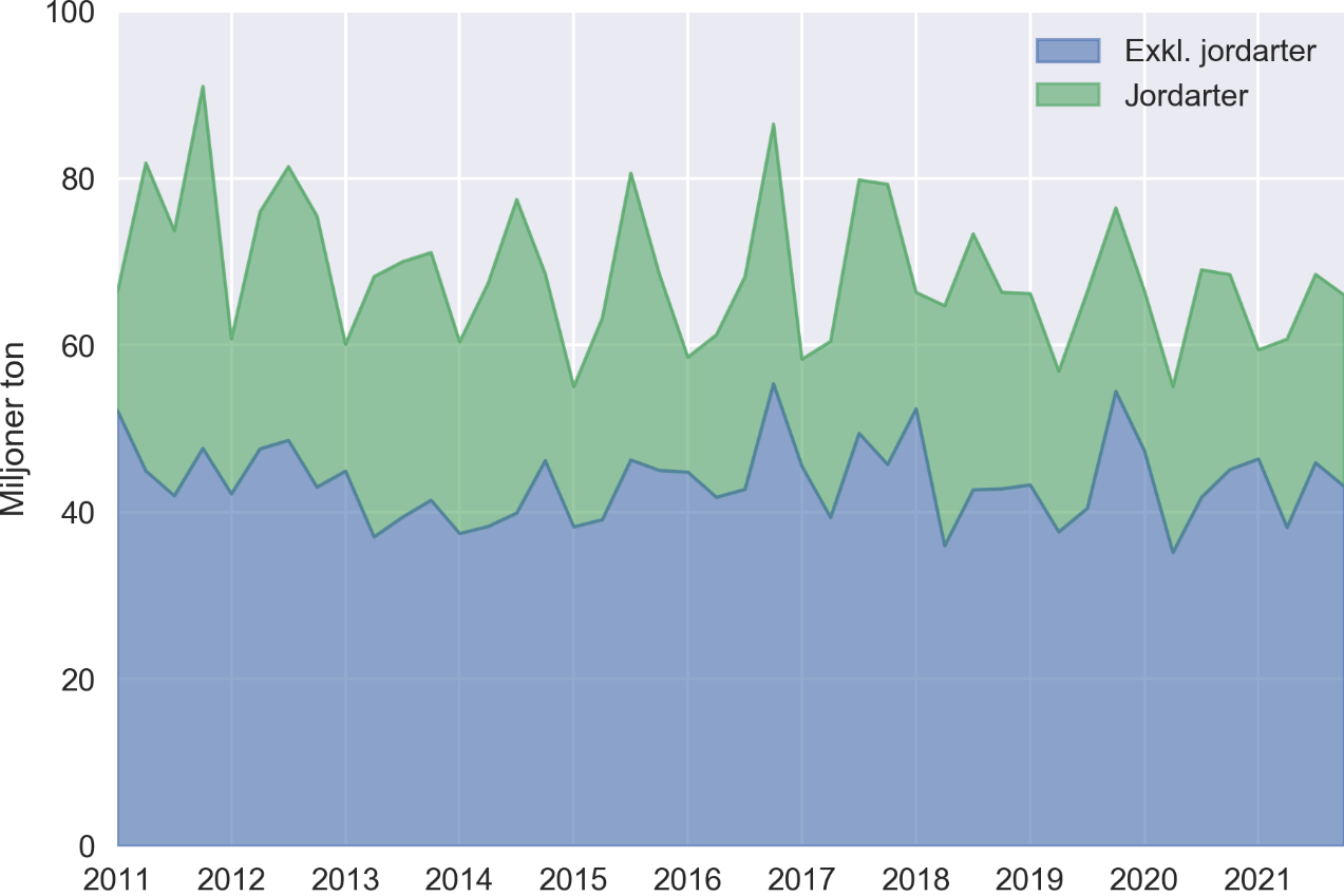 Godstransporter med lastbil inom landet kvartalsvis (källa: Statistikcentralen)