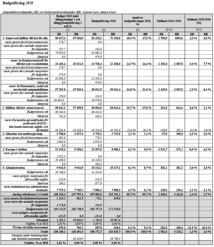 Nedan finns en tabell, presenterad tillsammans med kommissionens budgetförslag, om utvecklingen av åtaganden och betalningar per rubrik finansåren 2019–2020. Siffrorna för 2019 inkluderar tilläggsbudgetarna 1/2019, 2/2019 och 3/2019.